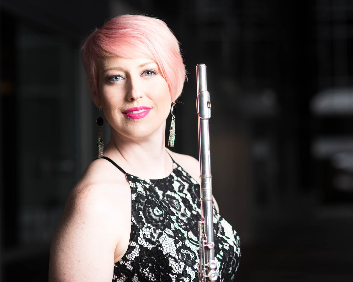 Next is Linda Kernohan’s Demon/Daemon, a performance art piece in which the flutist is both musician and actor as she is seemingly possessed by an evil spirit. Randall Woolf’s The Line of Purples for flute and pre-recorded electronics (2015) is the least harmonically experimental of the works so far, but perhaps the most complex to categorize. It begins as a popular rock anthem but journeys into a classical chamber work and then back again. Roger Zahab’s suspicion of nakedness, brings the listener on a an emotional journey through the tentative phrases of the flute melody interspersed with unsure pauses and rhythmic anxiety and hurriedness. This work ends abruptly to give way for Judith Shatin’s For the Fallen for amplified flute and electronics (2017). The fallen, in this case, is the fallen of all wars. Here Goodman offers a moving tribute, with the entire spectrum of possible flute sounds and colors though an electronic backdrop of dark chimes, pipes, gongs, and cymbals.